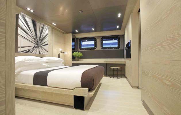 PH Design specialises in custom furniture and the bleached oak joinery as executed by Perini is superb. The main deck saloon area is completely open, with no separating bulkheads and only punctuated by a floating staircase between two pieces of structural glass that leads to the flybridge.