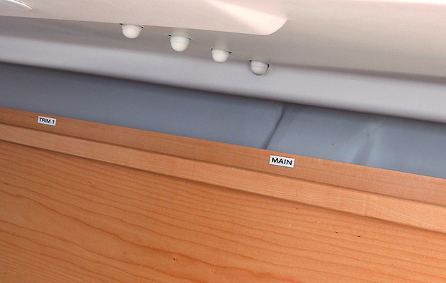 The standard 10.80 deck layout has floating blocks attached to a deck ring, with lines turning through deck organisers as they are led aft. This was changed so that clutches are aligned with their respective lines, rather than the boat’s fore-and-aft line, which obviates the need for the organisers, thus saving weight and reducing friction.