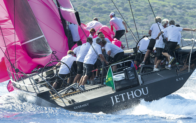 This initial fast ease of halyard and guy should allow the crew to bring the rest of the sail into the lee of the main. Then ease the halyard at the same pace as the crew pull the spinnaker over the boom.